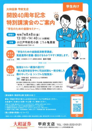 大和証券 甲府支店 開設40周年記念 特別講演会のご案内 開催日時 日時:2025年8月8日(金) 13...