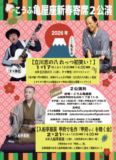 こうふ亀屋座では、2026年1月17日(土)と2月21日(土)に「新春寄席」を開催します。