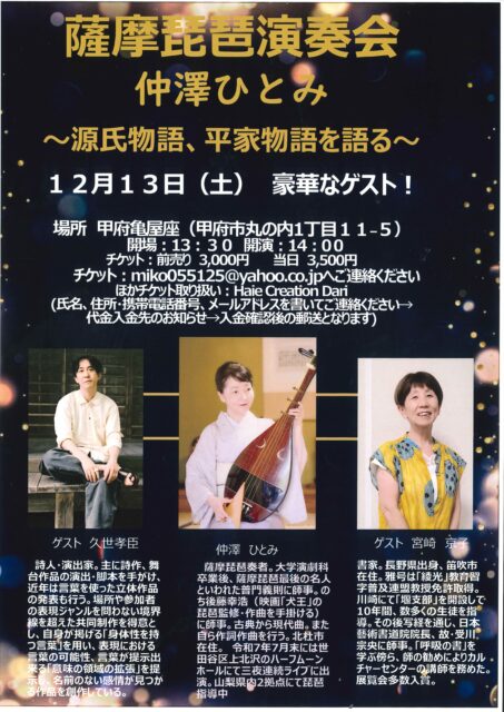 ≪終了≫【2025.12.13】薩摩琵琶演奏会 仲澤ひとみ ~源氏物語、平家物語を語る~